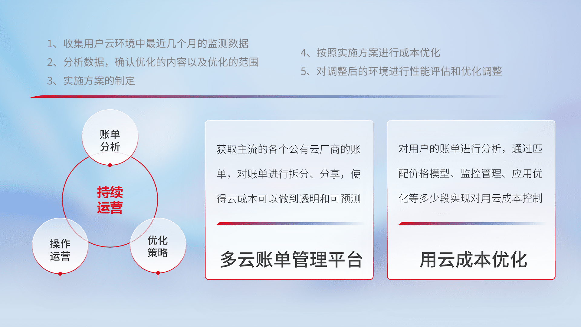 通过多云纳管,,,以统一的资源数据模型把客户的云资源进行抽象和封装,,,,进而实现对多云资源的统一操作,,,保障云资源管理的可靠性、、、稳定性与可用性。。。量身定制化运维内容,,,配置、、、、开发运维、、、补丁管理、、、、备份、、、监控、、、认证和访问管理、、、、审计和日常巡检等,,,保障在用云过程中的可靠度,,稳定度以及高可用率。。。